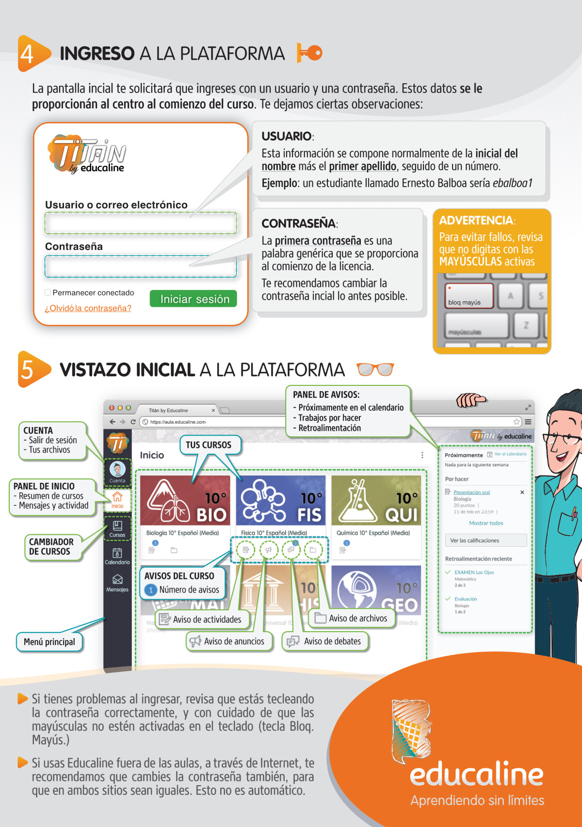 Si olvidó su usuario de acceso a la plataforma, debe enviarnos un correo a soporte@educaline.com, especificando lo siguiente:
